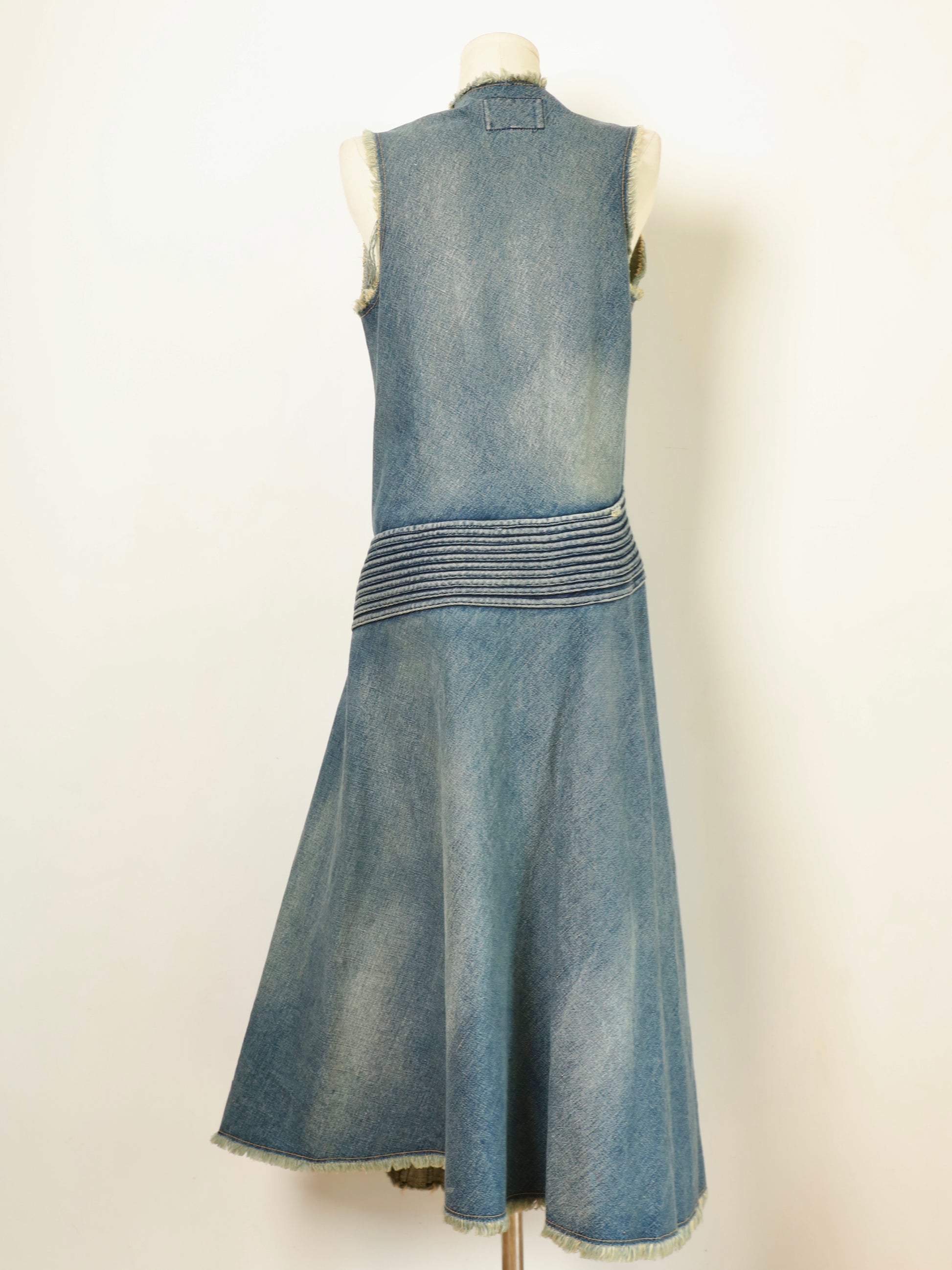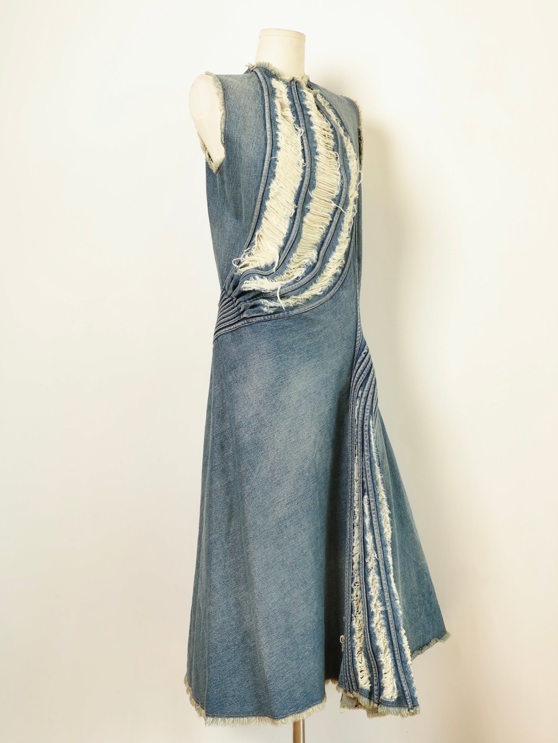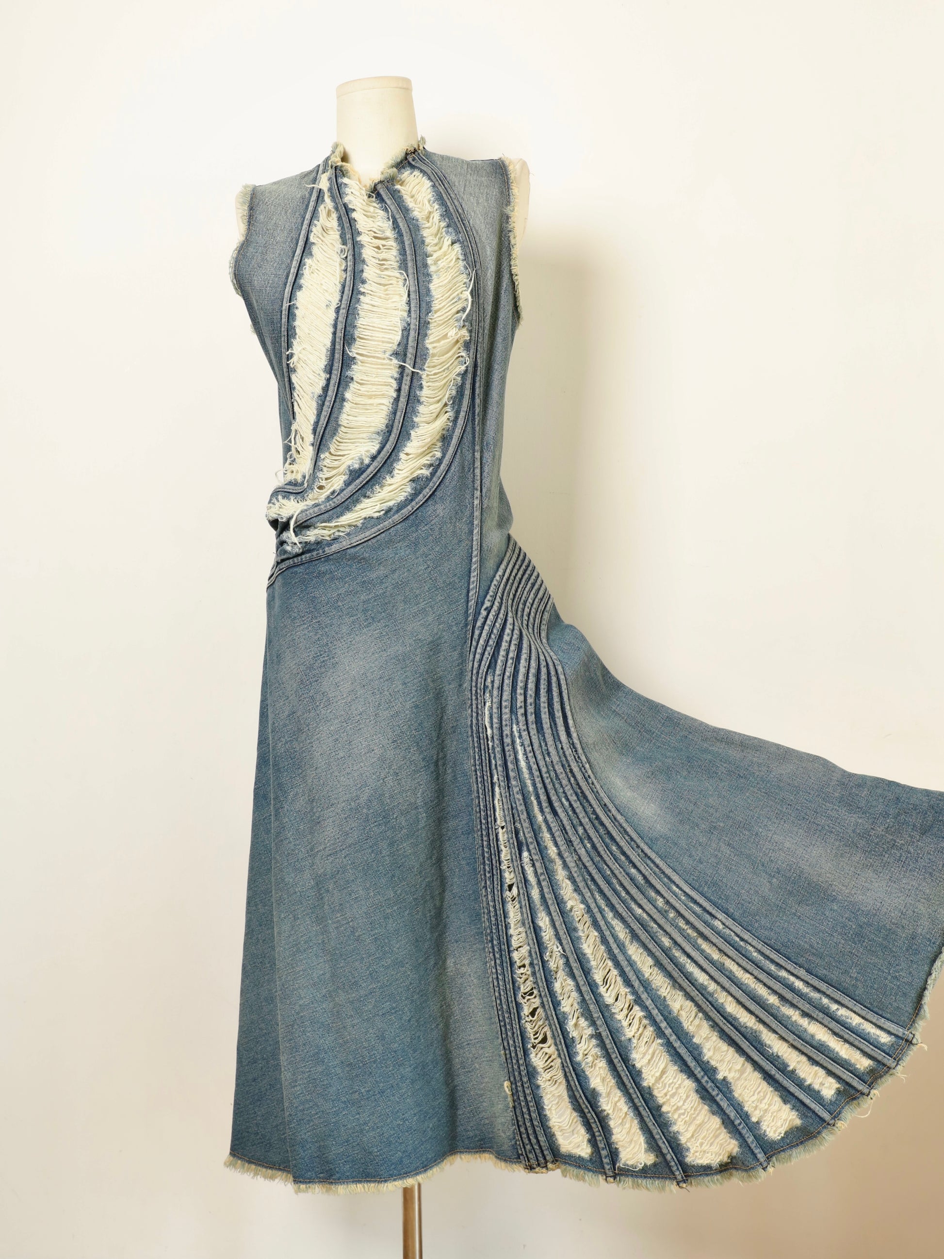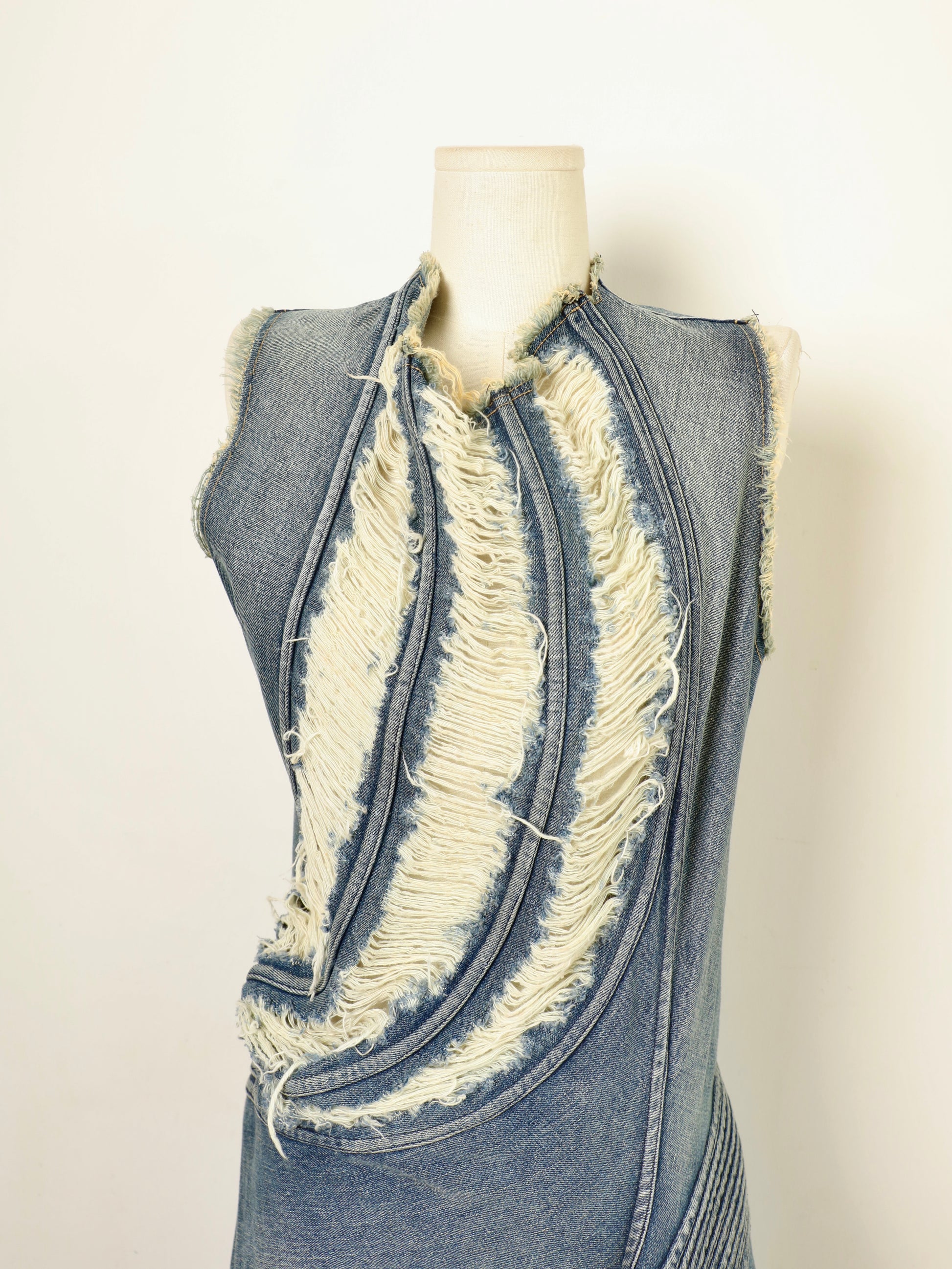 Multiple arched panels radiate across the front bodice, wrapping the torso in controlled volume. The inner denim fibers are intentionally pulled and reversed to create natural fringe textures, while arc-shaped seams and pressed lines along the sides expand subtly in motion, forming strong dynamic curves. An asymmetrical hem and wrap-style construction heighten the tension between fabric and body — restrained, precise, and unmistakably of the season.